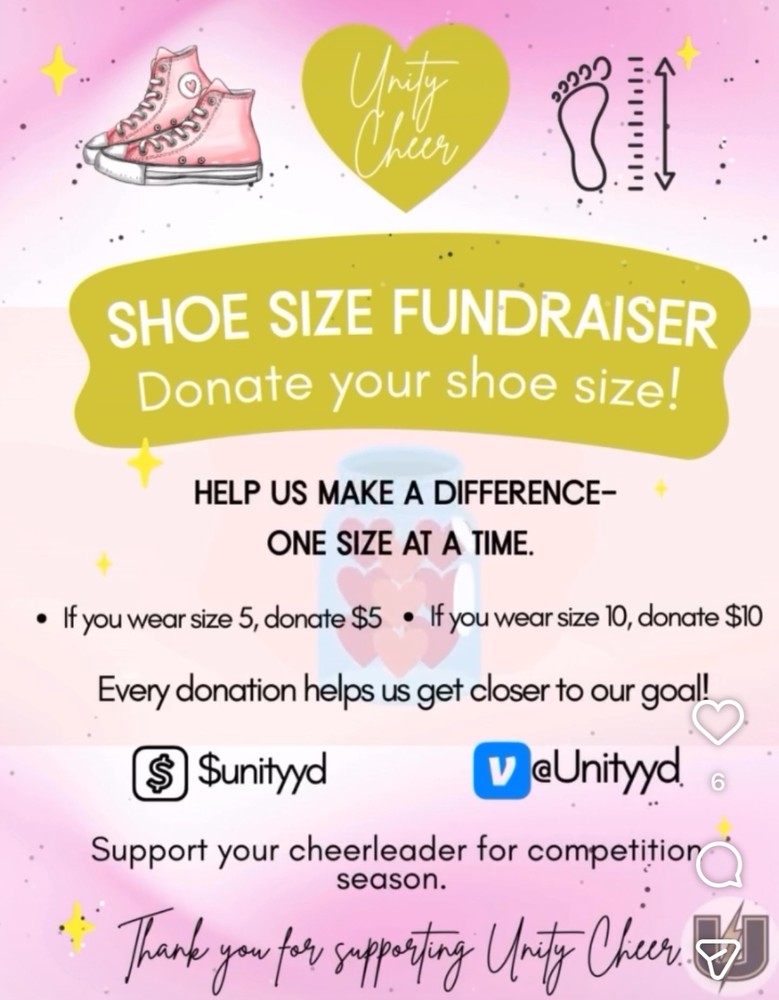 Help support UNITY Cheer with our "Shoe Size Fundraiser"! Donate your shoe size to help us raise money for competitions. If you wear size 5, donate $5. If you wear size 10, donate $10, etc.