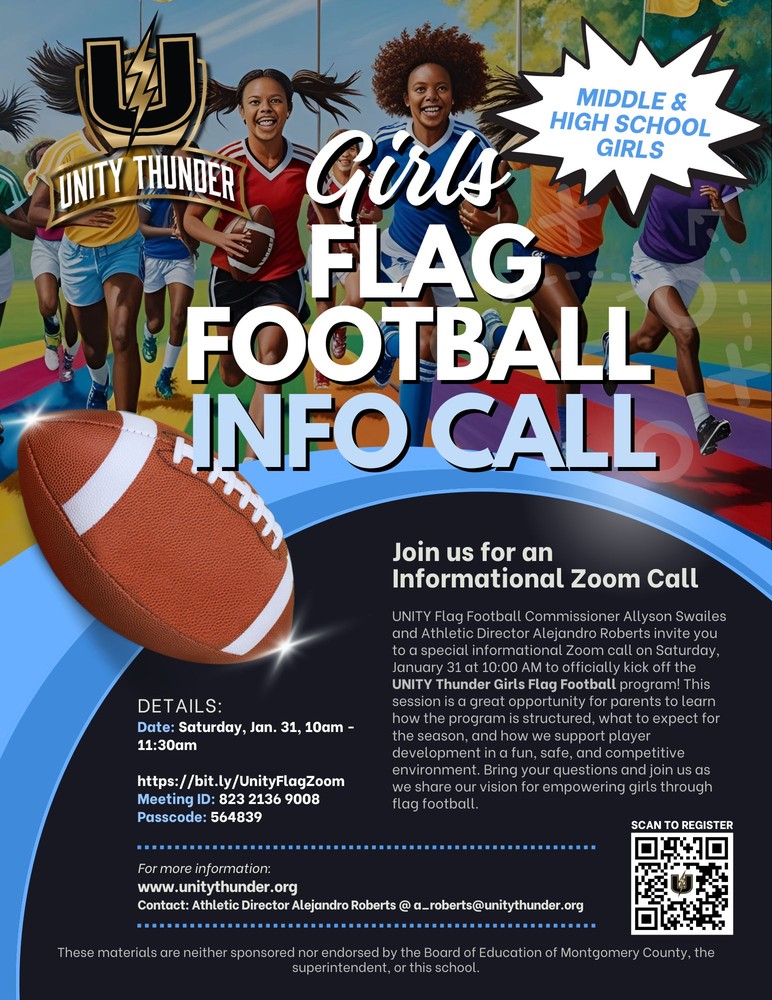 UNITY Flag Football Commissioner Allyson Swailes and Athletic Director Alejandro Roberts invite you to a special informational Zoom call on Saturday, January 24th at 10:00 AM to officially kick off the UNITY Thunder Girls Flag Football program! This session is a great opportunity for parents to learn how the program is structured, what to expect for the season, and how we support player development in a fun, safe, and competitive environment. Bring your questions and join us as we share our vision for empowering girls through flag football.